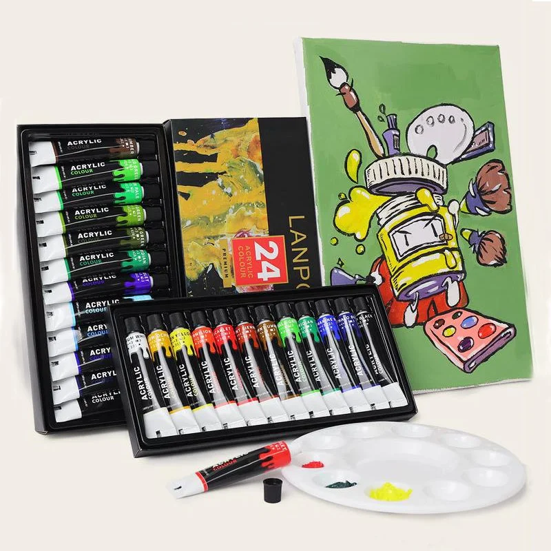 This acrylic paint starter set includes 12 or 24 vibrant colors in 12ml waterproof tubes.