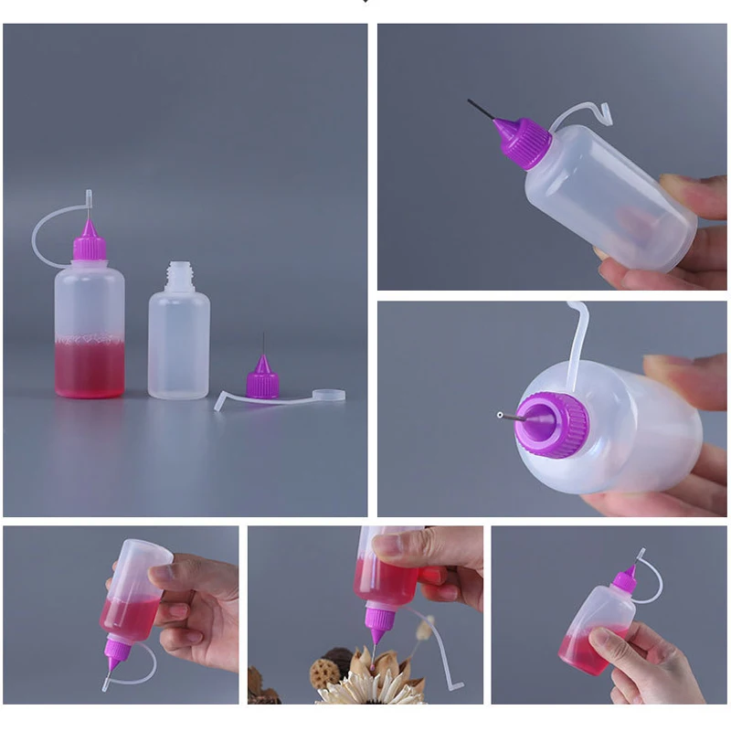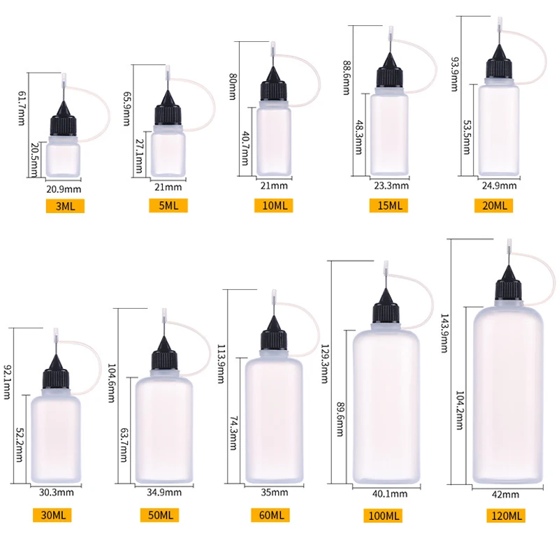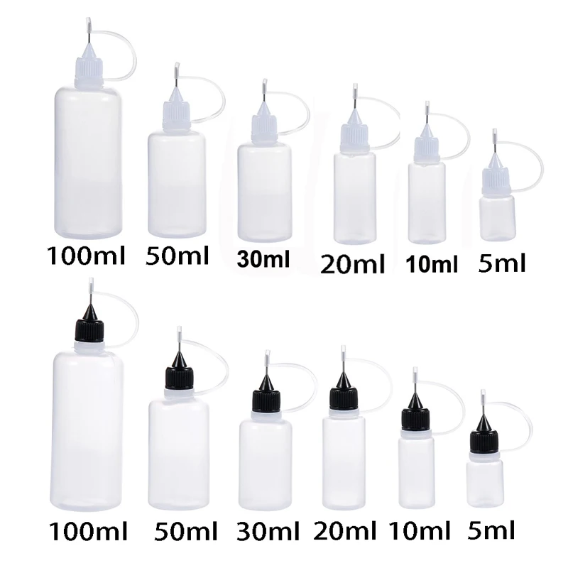 Easily dispense liquids with this 5-piece set of plastic squeezable needle bottles. Ranging from 3ml to 120ml, they are perfect for precise application of glue, ink, paint, or other liquids. Each bottle features a fine needle tip for controlled drops and minimal waste. The squeezable design allows you to adjust flow with ease. Refillable and durable, these containers are ideal for repeated use. Perfect for DIY crafts, laboratory work, or hobby projects. Lightweight and portable, they are easy to store or carry. Ideal for art, sewing, or other detailed applications. Safe and convenient for both professional and home use. Keep your liquids organized and easy to apply with this versatile dropper bottle set.